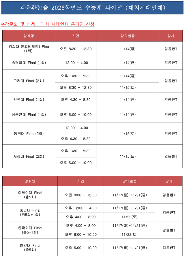 ※ 신청한 강좌의 취소 및 변경은 신청기한 내 사이트에서 가능 (이후로는 단과 010-5423-2378 (문자전용)으로 문의)